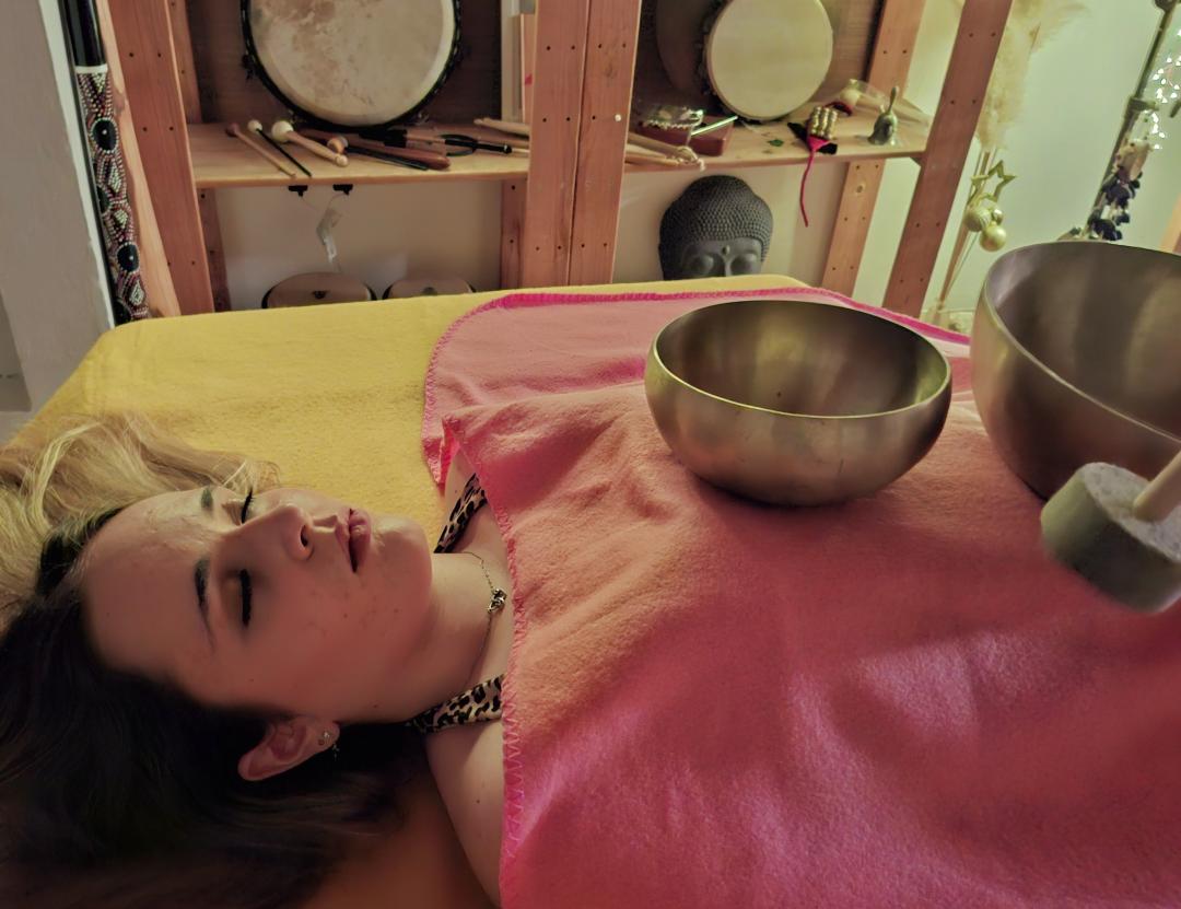 U zvučnoj masaži se ne radi o masaži u klasičnom smislu, već o masaži bez izravnog dodira između terapeuta i klijenta, povezuju ih zvučne zdjele koje se određenim slijedom i kombinacijama pozicioniraju na odjeveno tijelo te se palicom ozvučuju i stvaraju nježne zvučne vibracije koje se prenose na tijelo i stvaraju osjećaj ugode i duboke opuštenosti. Nježne vibracije se šire tijelom i stimuliraju svaku pojedinu stanicu. Korisnik leži tijekom terapije. Trajanje sesije je 1sat i isključivo je namenjena damama."